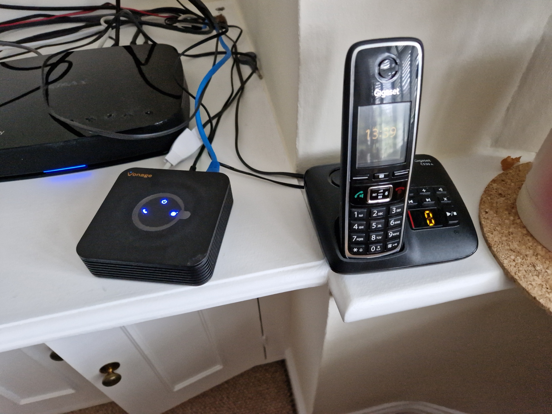Well he was right – we have it and it is called VOIP (Voice Over IP (Internet Protocol)). All the telephone providers in the UK are switching over to this now, which means your telephone has to plug into your router, wherever that is. In my case this is not in the hallway, where a telephone belongs, but next to the television on account of my broadband provider being a cable company.